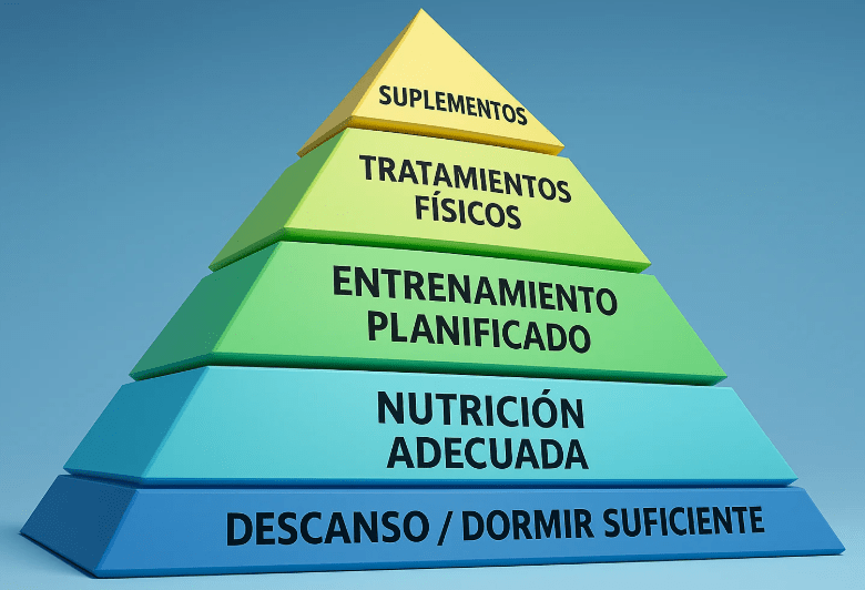 A continuación, una forma gráfica a través de la pirámide de lo que es importante (DESCANSO) hasta el nivel superior (SUPLEMENTOS).